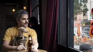 Ernesto Sevilla en un bar de Madrid junto a su galgo italiano, Elvis / Ignacio Gil