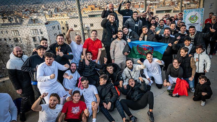 Jugadores de la Kings League gitana posan en el campo municipal de la Satalia, con Barcelona al fondo.